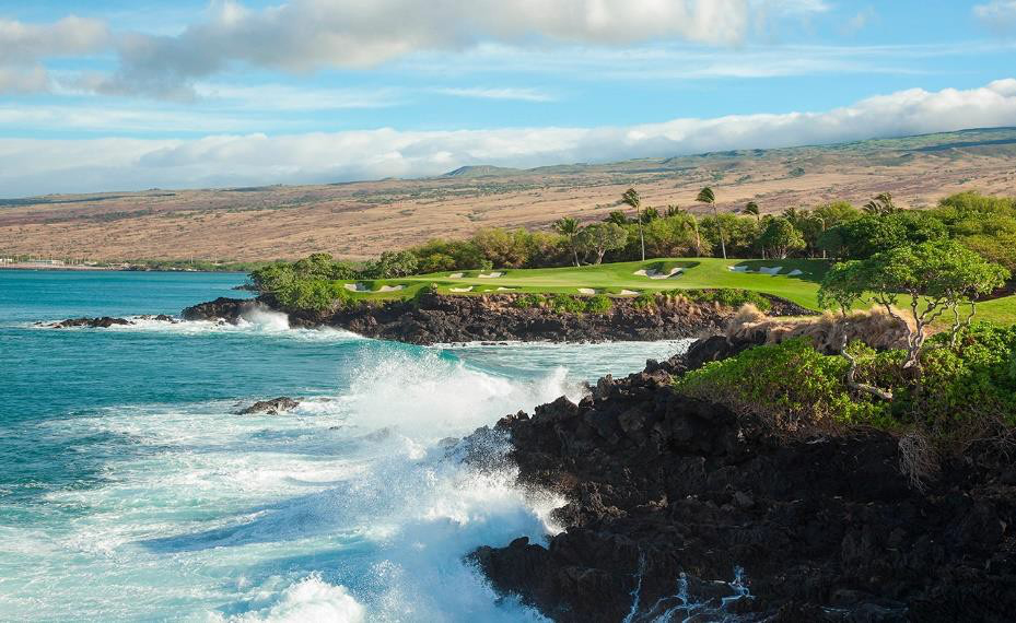 The hotel is nestled in natural bluffs overlooking the silky white sands of Hapuna Beach. In ancient times on the resort site, freshwater springs bubbled to the surface during heavy rainfall. These artesian fountains provided respite and renewal for travelers along the Kohala Coast, hence, the area is named Hāpuna or “spring” (“Spring of life”) in the Hawaiian language. Each of the great golf courses you will play during the tournament are located within Mauna Kea Resort. Your accommodation has been reserved in ocean view rooms and daily breakfast is included.